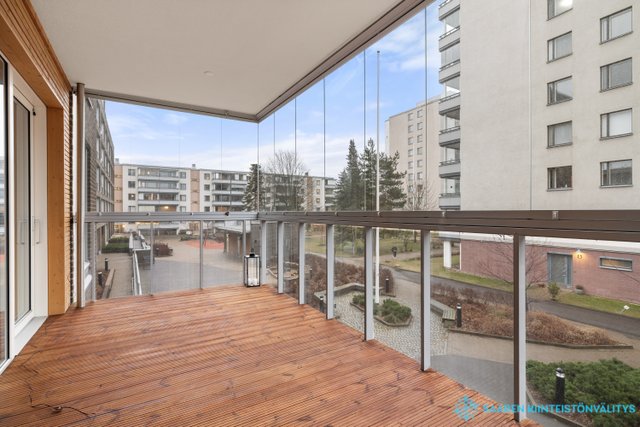 Iso lasitettu terassiparveke talon sisäpihan suuntaan