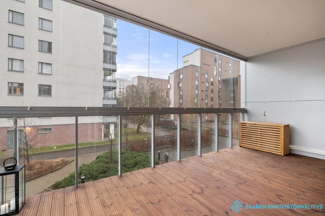 Parvekkelle kuljetaan lasisen liukuoven kautta olohuoneesta. Näkymät aukeaa talon sisäpihan suuntaan avaralle korttelipihalle. Parvekkeella on puinen terassi, joka on asennettu mittojen mukaan rakennusvaiheessa.